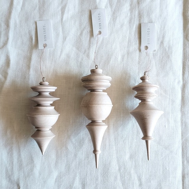 Guri&Co. の榎本至男さんが作る木製オーナメント3個セットです。 「自然の呼吸を大切にしたい」 その思いから、天然木、自然由来の塗料を使用し、美しい木工作品を作られています。 日々の生活の中で木の温もりを感じられる、心穏やかになる作品です。 こちらのお品は、細やかに削り出された繊細なオーナメントです。 流れるように美しく洗練されたフォルムは、クリスマスシーズンの彩りとしてはもちろん、日常のインテリアにも寄り添い、空間を上品に演出してくれます。 また、こちらはお好みのアロマオイルをひと滴落とせば、ほんのりと広がる香りが心を優しくほぐしてくれます。窓際や天井から吊るしたり、枕元に置くとリラックスした静かな時間へと導いてくれそうです。 木のオーナメントで優しさと温もりを感じていただけたらと思います。 ———— 材料:イタヤカエデ サイズ 大:長さ14センチ×直径4センチ 中:長さ9センチ×直径5センチ 小:長さ8.5センチ×直径4センチ テグス1メートルを付属としてお付けします。 インテリアに合わせて長さを調節してください。 *ご購入後、3日以内に配送いたします。 *複数ご購入の場合はレターパックでは配送できませんので、ゆうパックをお選びください。