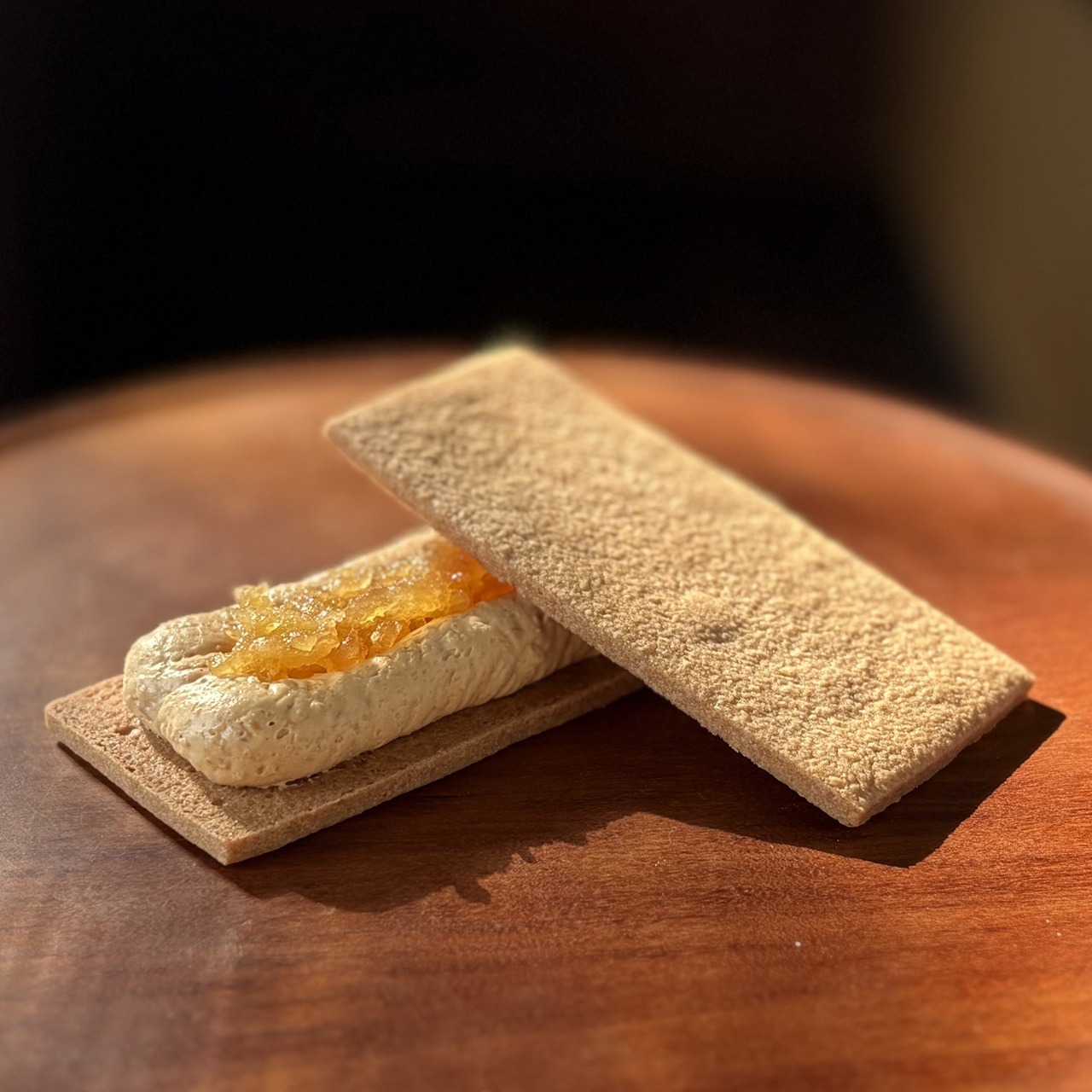 ココアサブレにほろ苦い抹茶のバタークリーム、真ん中にはパッションフルーツとホワイトチョコのガナッシュを、2つの味の重なりとパッションフルーツの種の食感もお楽しみ下さい。