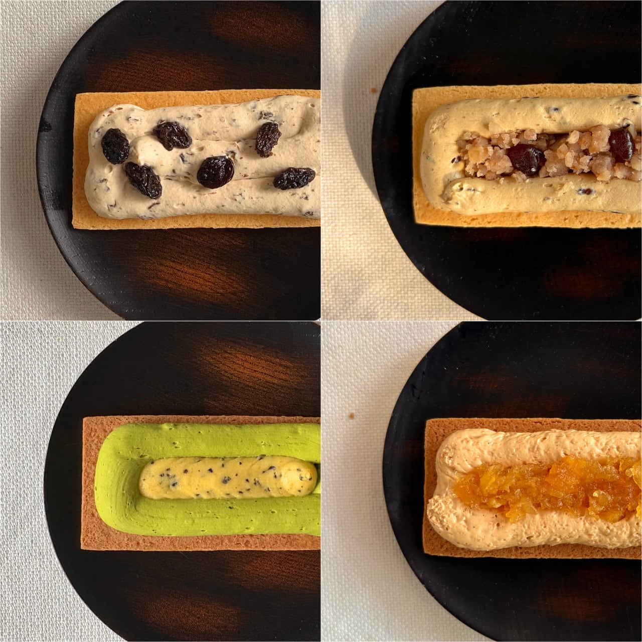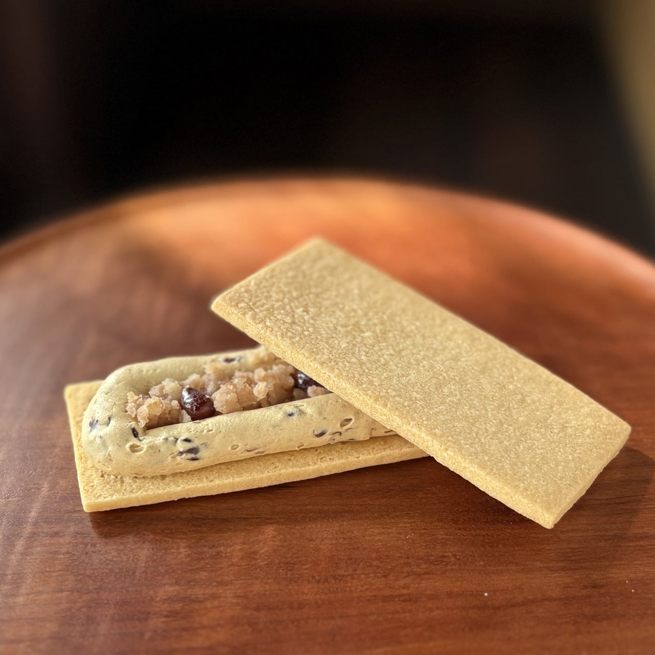 バニラサブレに香ばしい香りのほうじ茶バタークリーム、真ん中には味わいのしっかりしたスペイン産マロンと甘みのアクセントに大納言小豆をトッピング致しました。